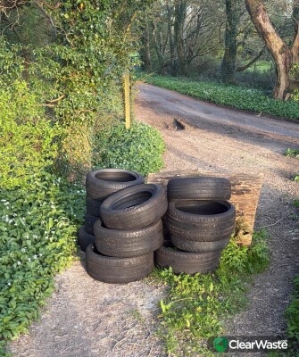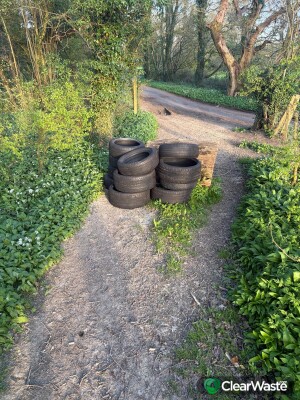 Rubber vehicle tyres stacked up behind a log at the top of a public footpath opposite St Andrew's church, Broadmere, Basingstoke.