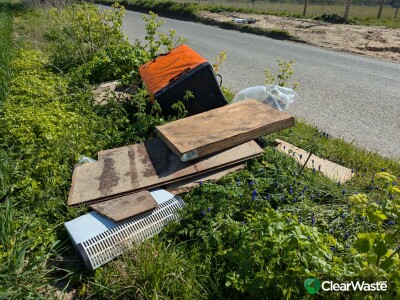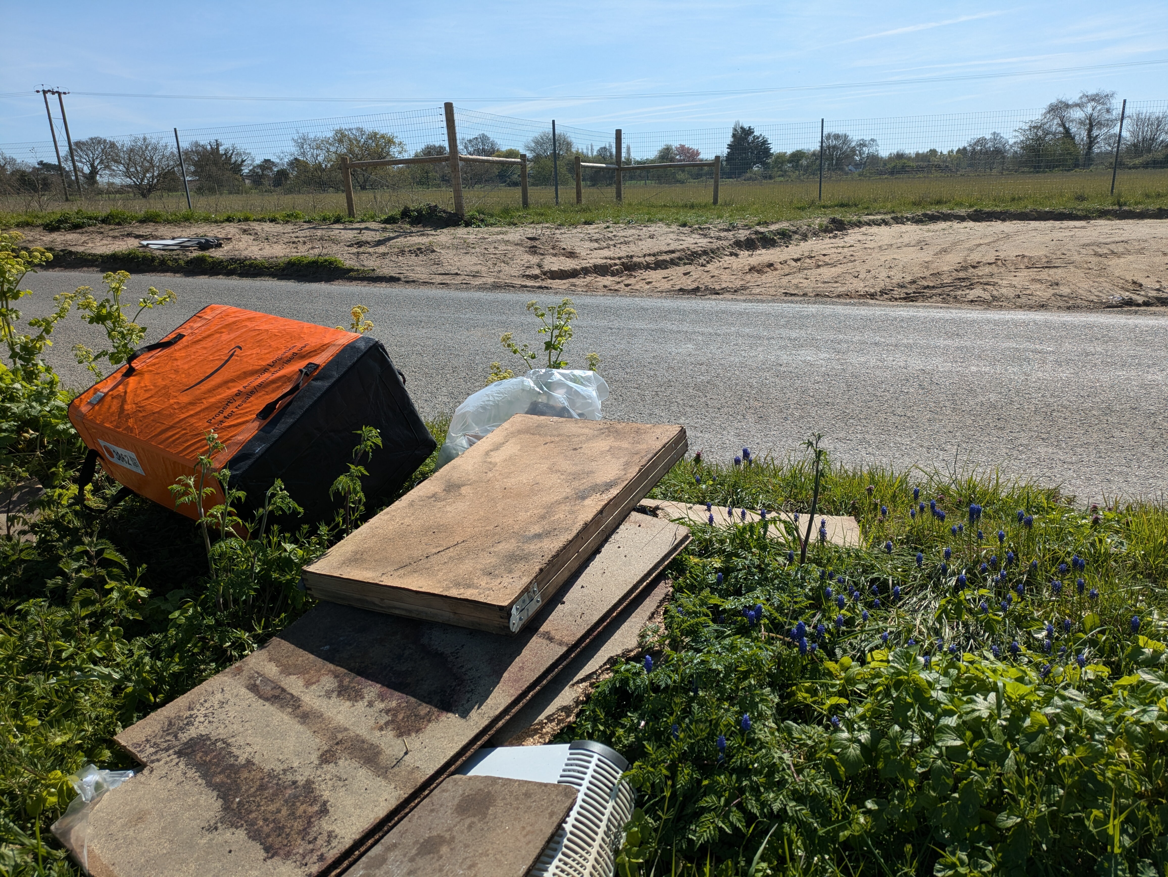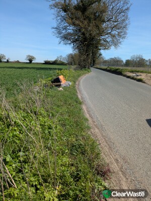 Orange bag and boards. Towards Tuddenham Road T Junction on the left by a Pull In.