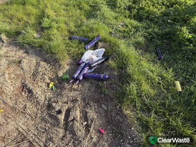 In lay-by near riverbank. 6 large nitrous oxide canisters plus assorted other litter