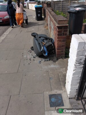 Black bin been set on fire Hazard on pavement needs removing been there over one week
