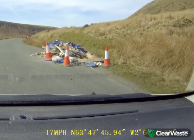 Large pile of rubble dumped on narrow single track lane. There are some road cones around it so it may have already been reported.