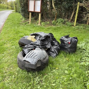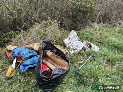 After village litter pick parts of bathroom, old tent, rumble and various bags