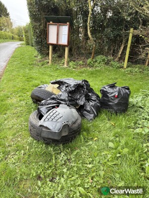 Waste gathered from Overton litter pick. Includes 2 tyres and assorted bagged litter.