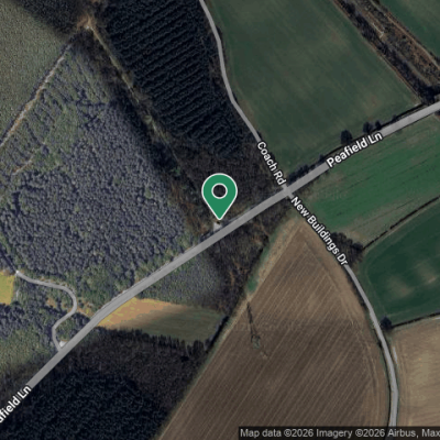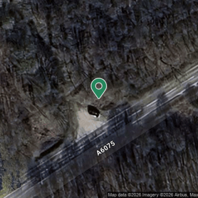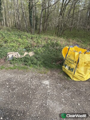 Large yellow builders bag, broken slabs, tire, black plastic bags at pull in to woods just before coach road turning