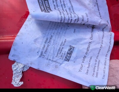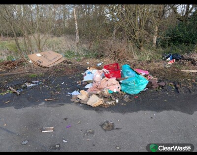 Pile of general waste. Some bricks from garden, cardboard and general household bagged waste. Item in pile shows name and address of household.