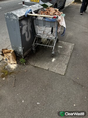 Supermarket trolley filled with rubble left on pavement