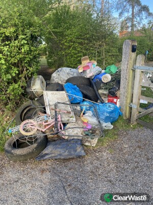 A selection of tyres metal boxes and plastic. Does at the entrance to Beech Hill Memorial Hall on Wood Lane Beech Hill