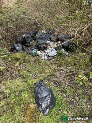 A number of black plastic bags have been dumped here. I am not sure what is in them.