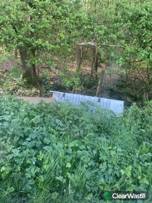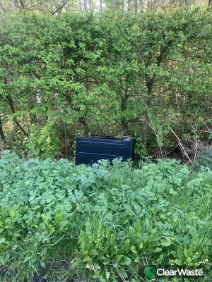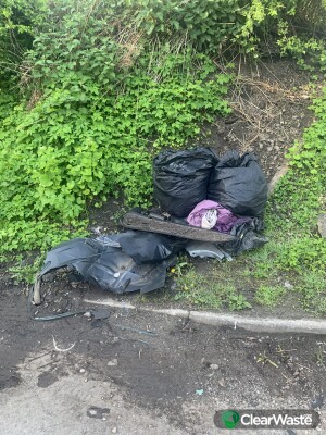 Rubbish bags in the lay-by further along towards Burntstump is a fridge and a washing machine in the hedge and a wooden cupboard on the other side of the road near the farm entrance.