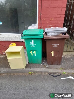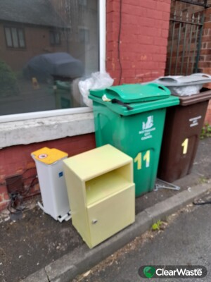 Bagged up waste in recycling bin and household items left outside of property that residents have vacated. Unknown if landlord aware
