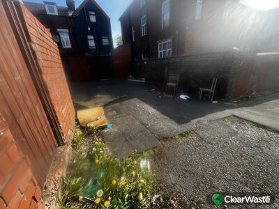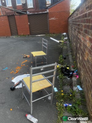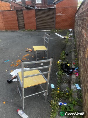 2 chairs, 2 pieces of foam that look like that they are from a couch or similar, numerous small gas canisters, a for sale sign