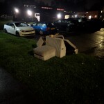 Two sofas. A fridge and a small cabinet as well as a mattress stuffed behind the communal Bins.