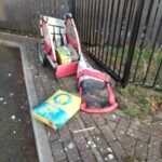 Large commercial type waste bin used to dump all sorts of rubbish including concrete and around it a suitcase, microwave, sink and bricks